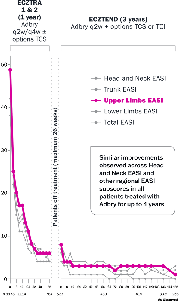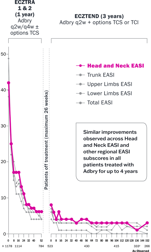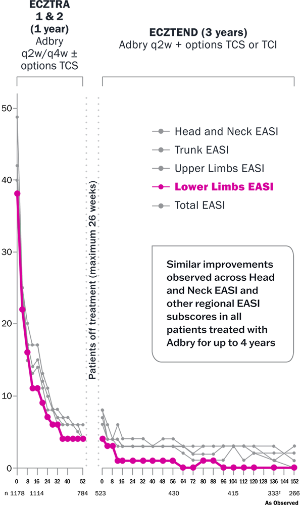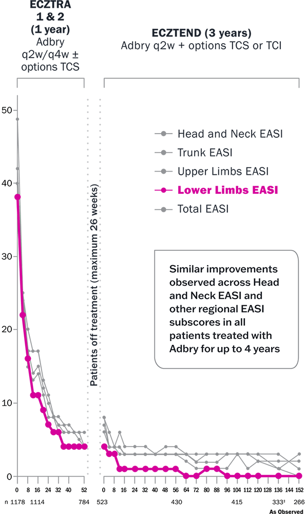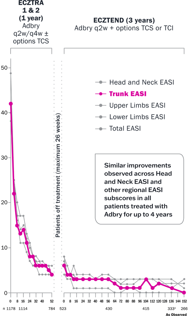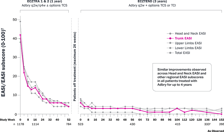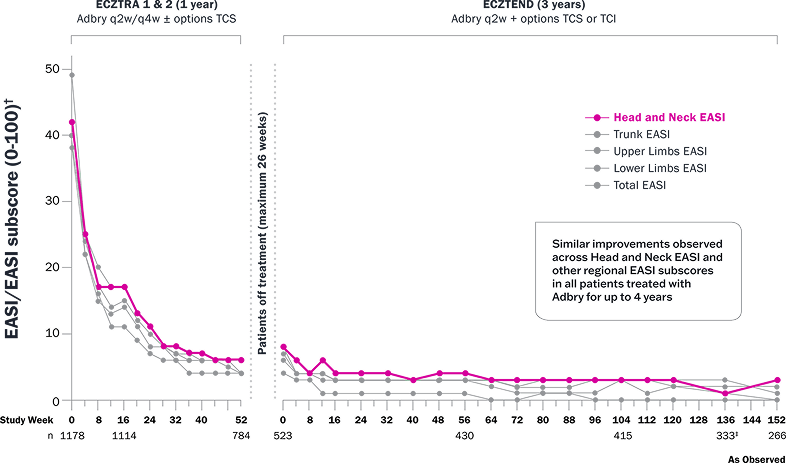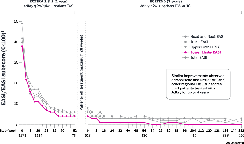 * Median EASI score at pivotal trial baseline: 26.7; at ECZTEND baseline: 4.7; at week 152: 1.4.3 † Variable time between last treatment in parent trial and first treatment in ECZTEND (maximum 26 weeks). ‡ A total of 2666 patients from the ECZTRA 1, 2, 3, 5, 6, 7, and 8 parent trials were enrolled in ECZTEND as of data cutoff. Data presented from a post-hoc interim analysis of an ongoing OLE trial represent a selected subgroup of patients (n=347) from the parent trials ECZTRA 1 and 2 who elected to enter the ECZTEND trial and had consistently received Adbry for a total of up to 4 years at data cutoff (April 30, 2022). As such, data may not be generalizable to the full Adbry population.