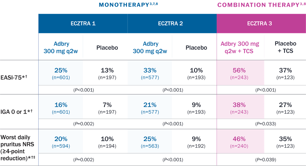 ECZTRA 3 (P=0.039): Adbry 300 mg q2w + TCS: 46% (n=240); Placebo + TCS: 35% (n=123)